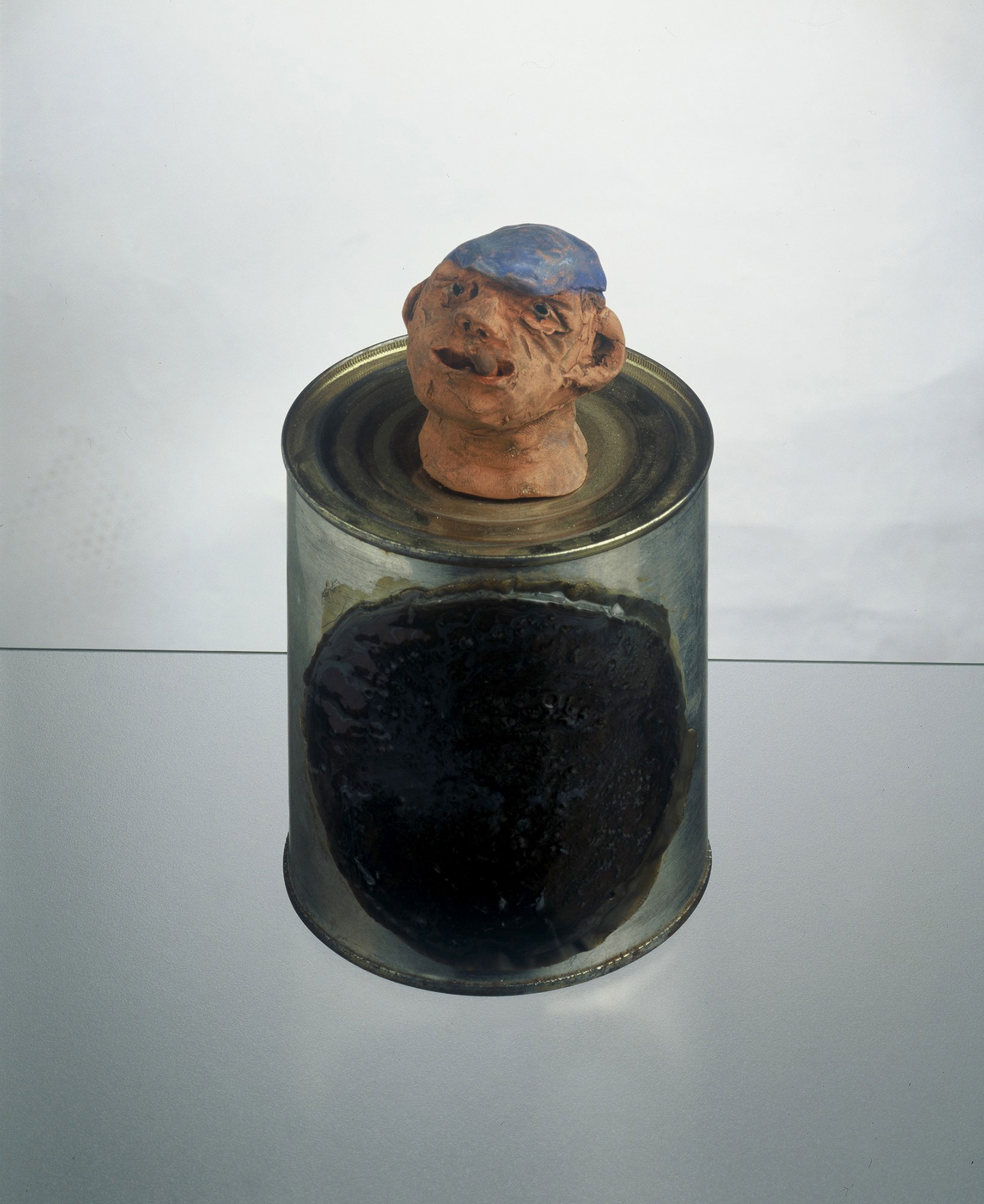 glina, konzerva, žica, blago / clay, can, wire, textile ,17,5 x 9 x 10 cm